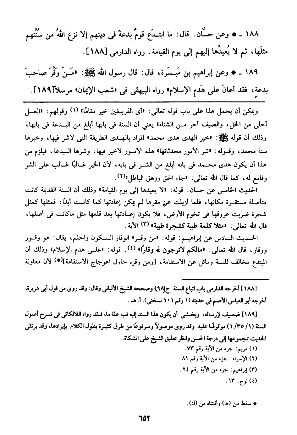 188 - وعن حسان. قال: ما ابتدع قوم بدعة في دينهم إلا نزع الله من سنتهم مثلها، ثم لا يعيدها إليهم إلى يوم القيامة. رواه الدارمي [188].