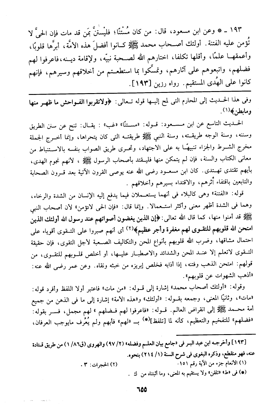193 - وعن ابن مسعود، قال: من كان مستنا؛ فليستن بمن قد مات فإن الحي لا تؤمن عليه الفتنة. أولئك أصحاب محمد صلى الله عليه وسلم كانوا أفضل هذه الأمة، أبرها قلوباً، وأعمقها علماً، وأقلها تكلفاً، اختارهم الله لصحبة نبيه، ولإقامة دينه، فاعرفوا لهم فضلهم، واتبعوهم على آثارهم، وتمسكوا بما استطعتم من أخلاقهم وسيرهم، فإنهم كانوا على الهدى المستقيم. رواه رزنين [193].