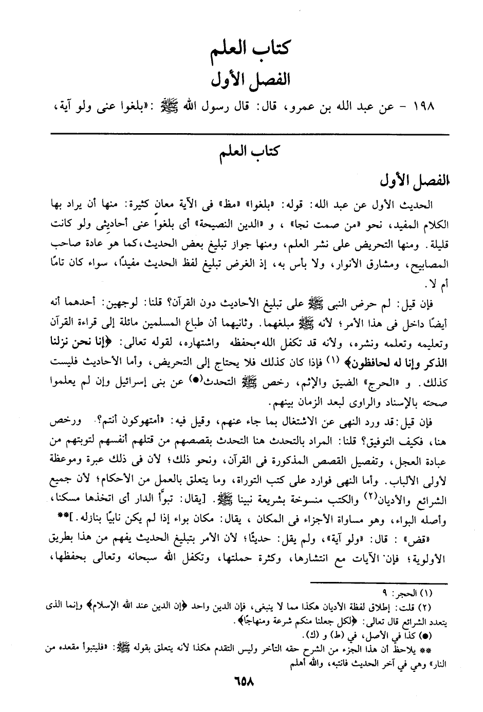 الحديث الأول عن عبد الله: قوله: ((بلغوا)) ((مظ)) في الآية معان كثيرة: منها أن يراد بها الكلام المفيد، نحو ((من صمت نجا))، و ((الدين النصيحة)) أي بلغوا عني أحاديثي ولو كانت قليلة. ومنها التحريض على نشر العلم، ومنها جواز تبليغ بعض الحديث، كما هو عادة صاحب المصابيح، ومشارق الأنوار، ولا بأس به، إذ الغرض تبليغ لفظ الحديث مفيداً، سواء كان تاماً أم لا.