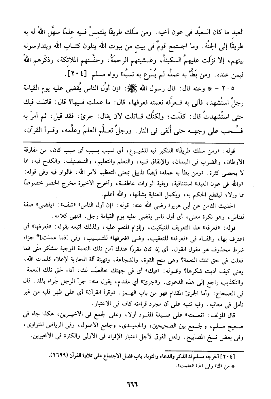 205 - وعنه قال: قال رسول الله صلى الله عليه وسلم: ((إن أول الناس يقضى عليه يوم القيامة رجل استشهد، فأتى به فعرفه نعمته فعرفها، قال: ما عملت فيها؟ قال: قاتلت فيك حتى استشهدت قال: كذبت؛ ولكنك قاتلت لأن يقال: جريء، فقد قيل، ثم أمر به فسحب على وجهه حتى ألقي في النار. ورجل تعلم العلم وعلمه، وقرأ القرآن،