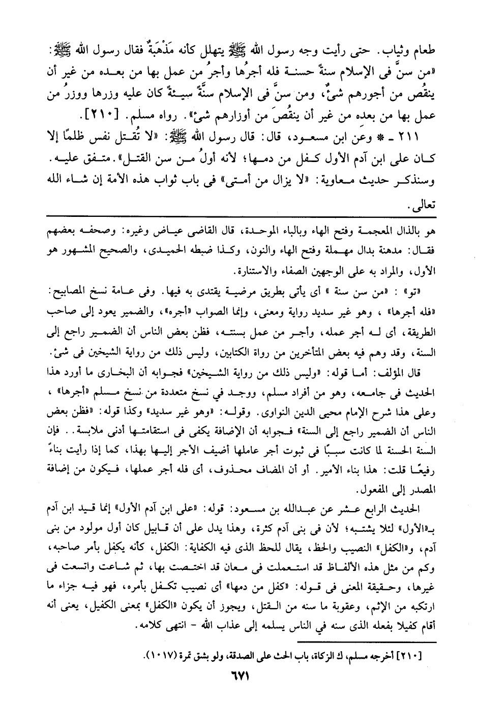 211 - وعن ابن مسعود، قال: قال رسول الله صلى الله عليه وسلم: ((لا تقتل نفس ظلماً إلا كان على ابن آدم الأول كفل من دمها؛ لأنه أول من سن القتل)). متفق عليه. وسنذكر حديث معاوية: ((لا يزال من أمتي)) في باب ثواب هذه الأمة إن شاء الله تعالى.