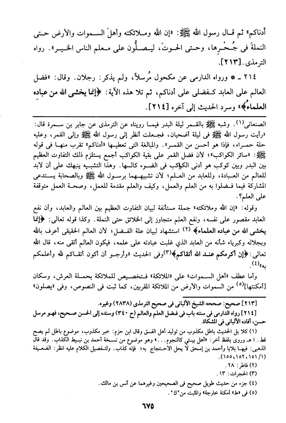 214 - ورواه الدارمي عن مكحول مرسلاً، ولم يذكر: رجلان. وقال: ((فضل العالم على العابد كفضلي على أدناكم، ثم تلا هذه الآية: {إنما يخشى الله من عباده العلماء})) وسرد الحديث إلى آخره [214].
