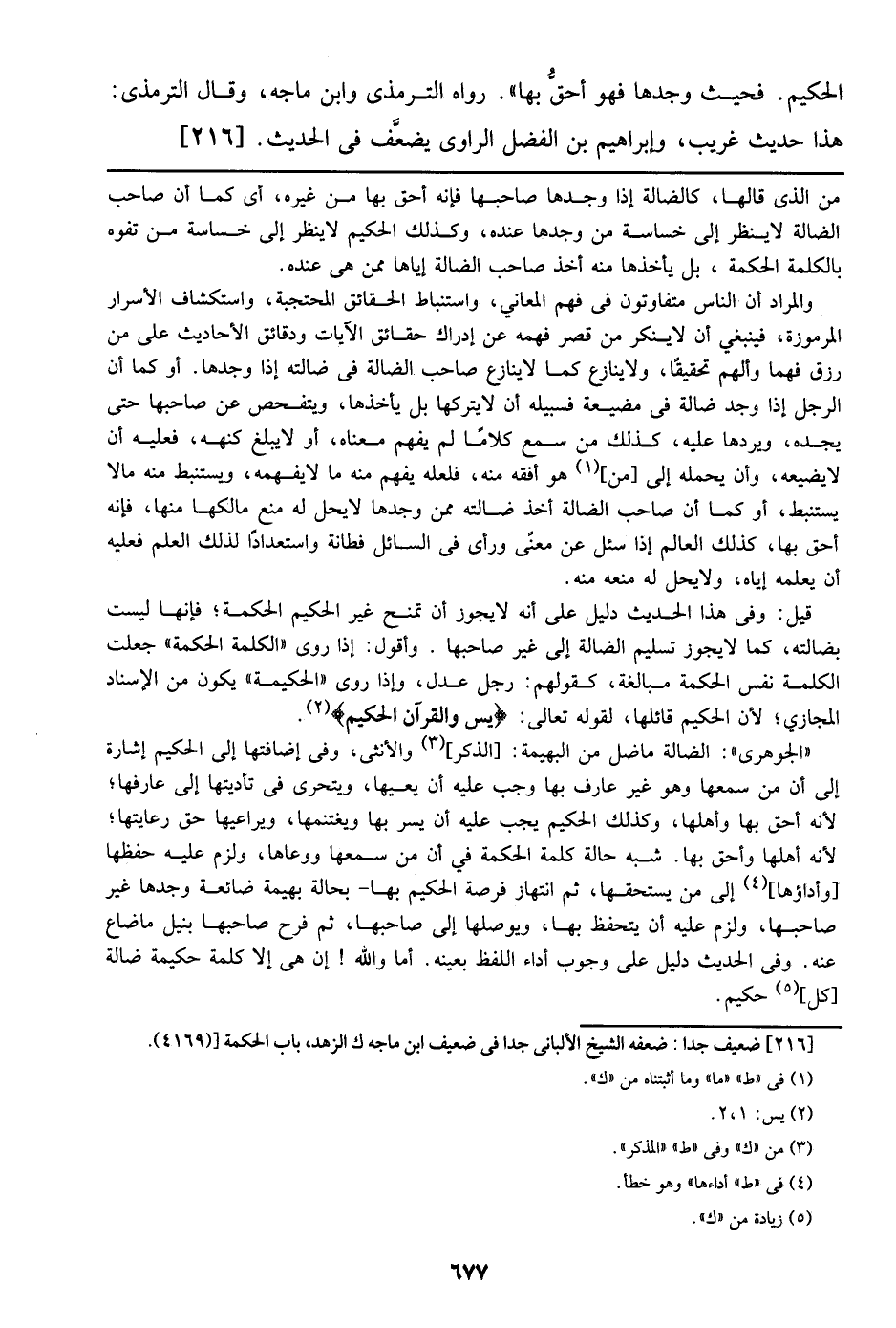((الجوهري)): الضالة ما ضل من البهيمة: [الذكر] والأنثى، وفي إضافتها إلى الحكيم إشارة إلى أن من سمعها وهو غير عارف بها وجب عله أن يعيها، ويتحرى في تأديتها إلى عارفها؛ لأنه أحق بها وأهلها، وكذلك الحكيم يجب عليه أن يسر بها ويغتنمها، ويراعيها حق رعايتها؛ لأنه أهلها وأحق بها. شبه حالة كلمة الحكمة في أن من سمعها ووعاها، ولزم عليه حفظها [وأداؤها] إلى من يستحقها، ثم انتهاز فرصة الحكيم بها- بحالة بهيمة ضائعة وجدها غير صاحبها، ولزم عليه أن يحتفظ بها، ويوصلها إلى صاحبها، ثم فرح صاحبها بنيل ما ضاع عنه. وفي الحديث دليل على وجوب أداء اللفظ بعينه. أما والله! إن هي إلا كلمة حكيمة ضالة [كل] حكيم.