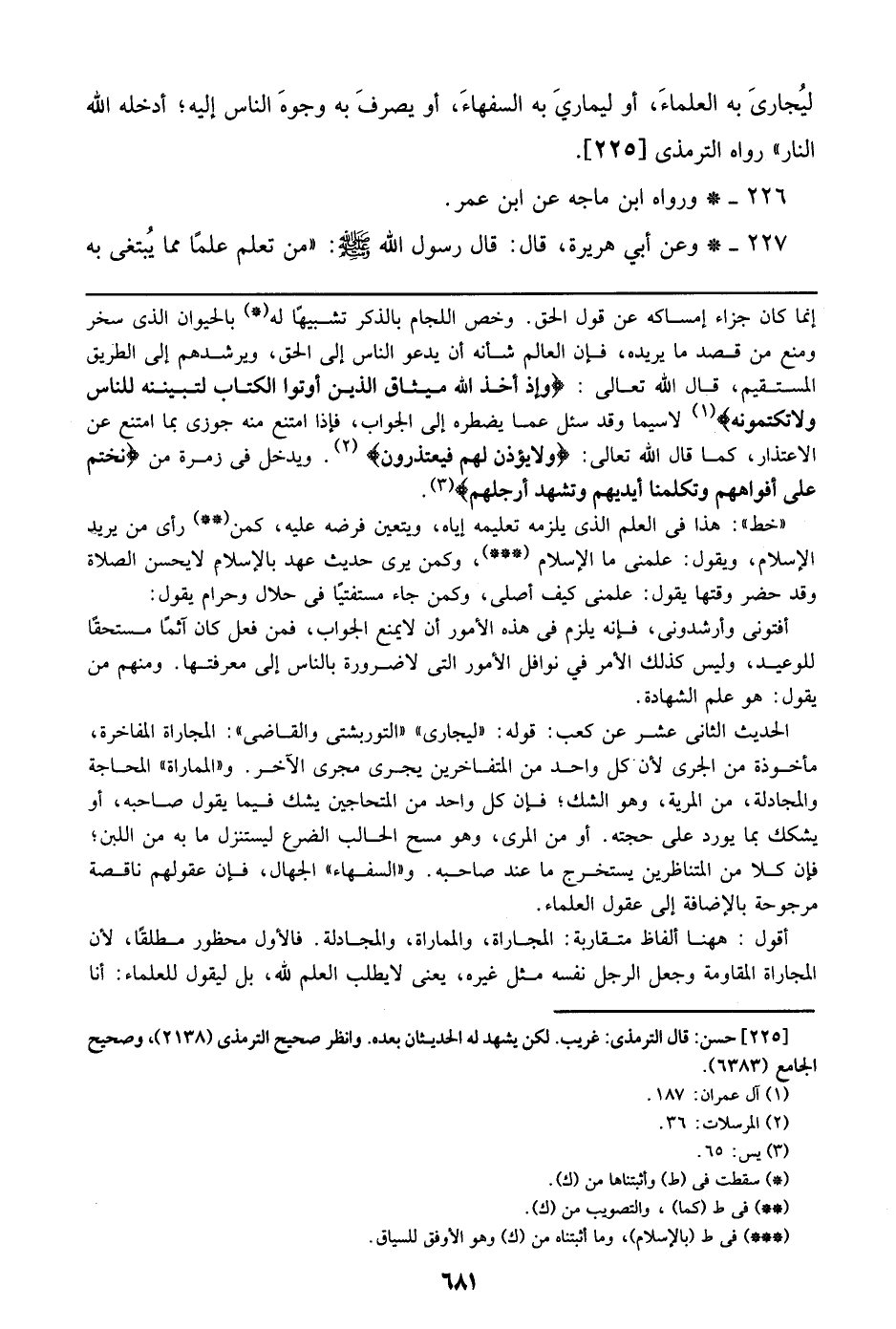 أوقل: ههنا ألفاظ متقاربة: المجاراة، والمماراة، والمجادلة. فالأول محظور مطلقاً، لأن المجاراة المقاومة وجعل الرجل نفسه مثل غيره، يعني لا يطلب العلم لله، بل ليقول للعلماء: أنا