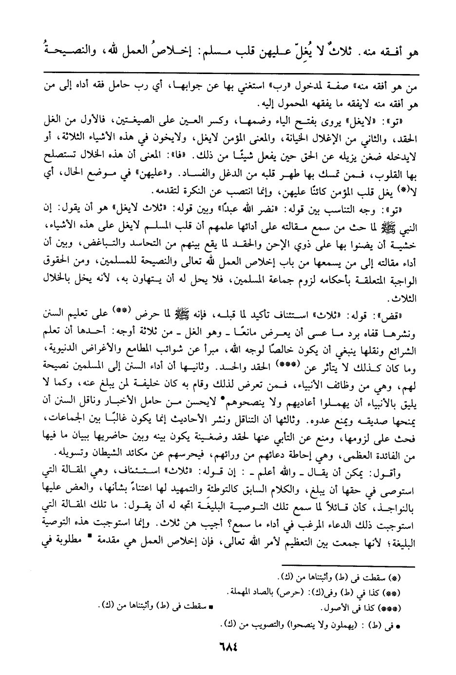 ((تو)): ((لا يغل)) يروى بفتح الياء وضمها، وكسر العين على الصيغتين، فالأول من الغل الحقد، والثاني من الإغلال الخيانة، والمعنى المؤمن لا يغل، ولا يخون في هذه الأشياء الثلاثة، أو لا يدخله ضغن يزيله عن الحق حين يفعل شيئاً من ذلك. ((فا)): المعنى أن هذه الخلال تستصلح بها القلوب، فمن تمسك بها طهر قلبه من الدغل والفساد. و ((عليهن)) في موضع الحال، أي لا يغل قلب المؤمن كائناً عليهن، وإنما انتصب عن النكرة لتقدمه.