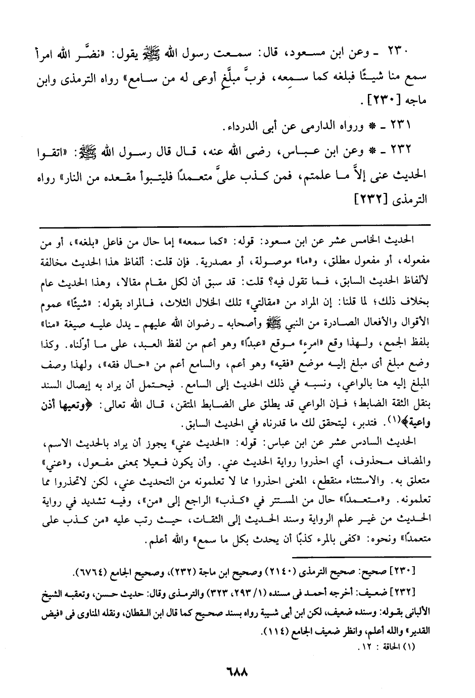 230 - وعن ابن مسعود، قال: سمعت رسول الله صلى الله عليه وسلم يقول: ((نضر الله امرأ سمع منا شيئاً فبلغه كما سمعه، فرب مبلغ أوعى له من سامع)) رواه الترمذي وابن ماجه [230].