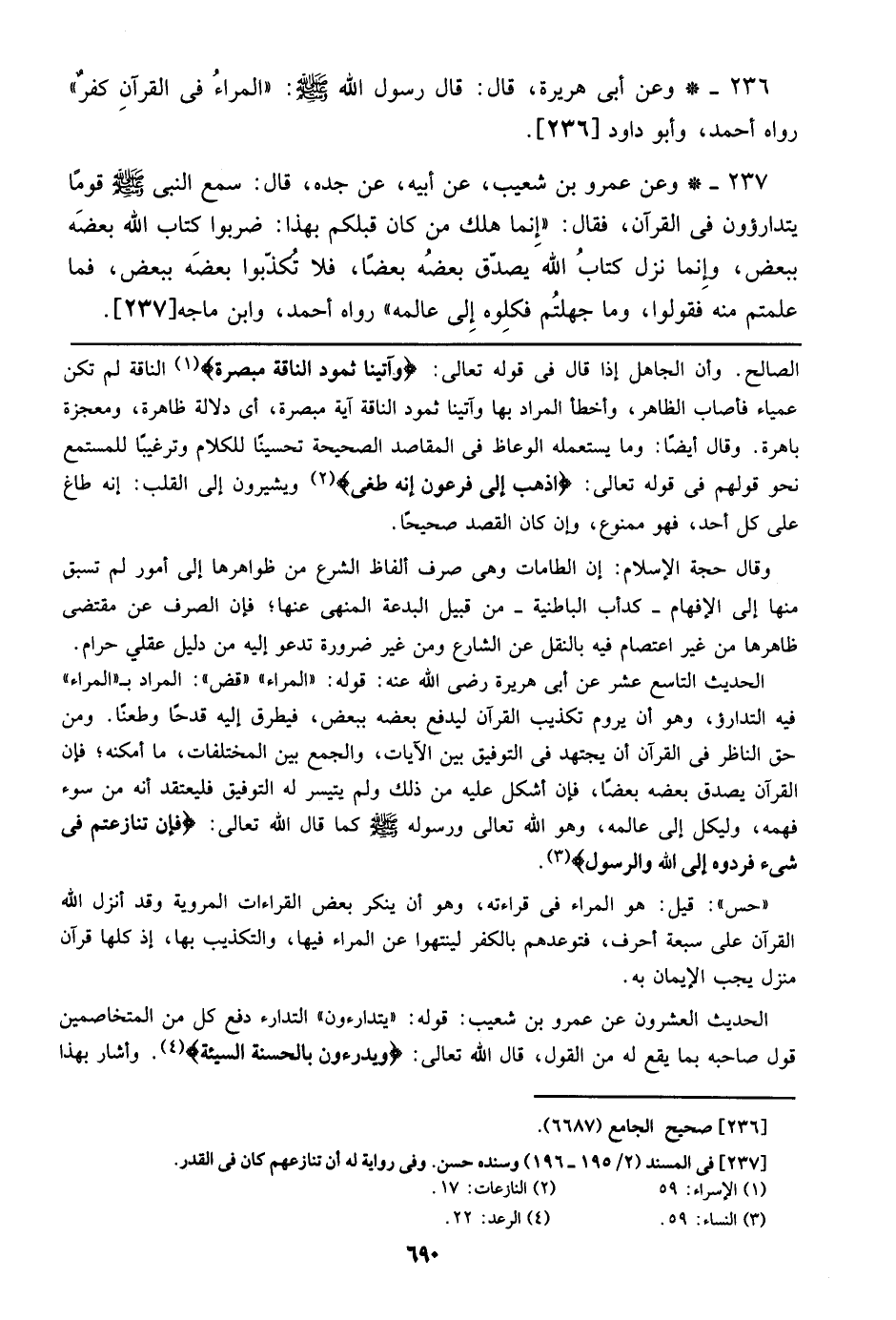 236 - وعن أبي هريرة، قال: قال رسول الله صلى الله عليه وسلم: ((المراء في القرآن كفر)) رواه أحمد، وأبو داود [236].