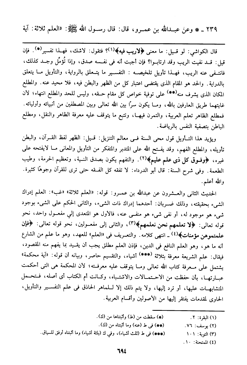 239 - وعن عبد الله بن عمرو، قال: قال رسول الله صلى الله عليه وسلم: ((العلم ثلاثة: آية