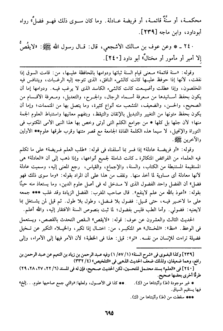 وقوله: ((أو فريضة عادلة)) إذا فسر بما أسلفناه في قوله: ((طلب العلم فريضة)) على ما تكلم فيه العلماء من الفرائض المتكاثرة- كانت شاملة لجميع أنواعها، وإذا ذهب إلى أن ((العادلة)) هي المستقيمة المستنبطة من الكتاب، والسنة، والإجماع، والقياس، رجع المعنى إليه، وسميت عادلة لأنها معادلة أي مساوية لما أخذ منها. ونقف من هذا على أن المراد بقوله: ((وما سوى ذلك فهو فضل)) أن الفضل واحد الفضول الذي لا مدخل له في أصل علوم الدين، وما يستعاذ منه حيناً بقوله: ((أعوذ بالله من علم لا ينفع)). قال صاحب المغرب: الفضل الزيادة وقد غلب جمعه على ما لا خير فيه، حتى قيل: فضول بلا فضل، وطول بلا طول. ثم قيل لمن يشتغل بما لا يعنيه: فضولي. وأما الطب فليس بفضول؛ لما ثبت بنصوص السنة الافتقار إليه، والله أعلم.