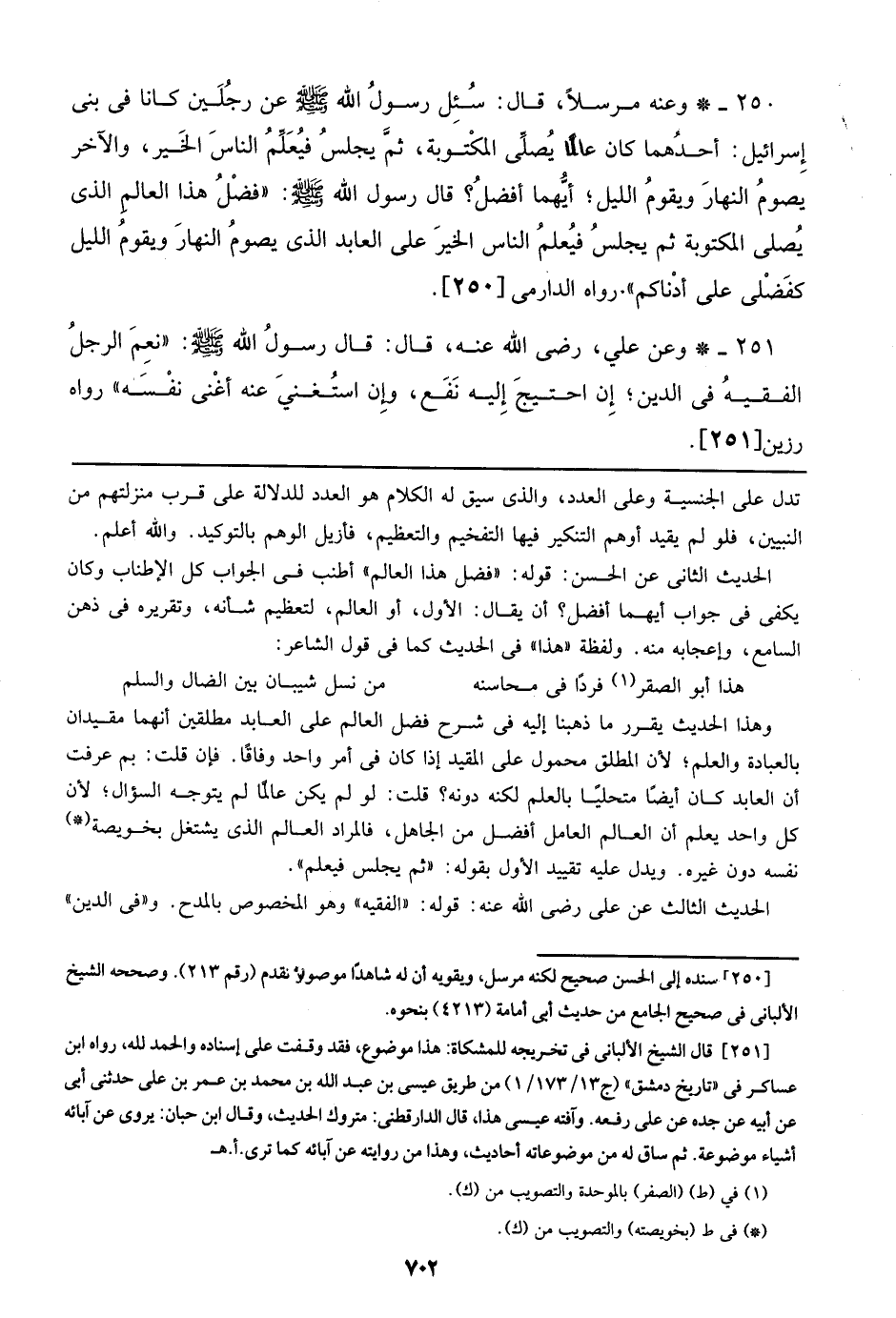 250 - وعنه، مرسلاً، قال: سئل رسول الله صلى الله عليه وسلم عن رجلين كانا في بني إسرائيل: أحدهما كان عالماً يصلي المكتوبة، ثم يجلس فيعلم الناس الخير، والآخر يصوم النهار ويقوم الليل؛ أيهما أفضل؟ قال رسول الله صلى الله عليه وسلم: ((فضل هذا العالم الذي يصلي المكتوبة ثم يجلس فيعلم الناس الخير على العابد الذي يصوم النهار ويقوم الليل كفضلي على أدناكم)). رواه الدارمي [250].