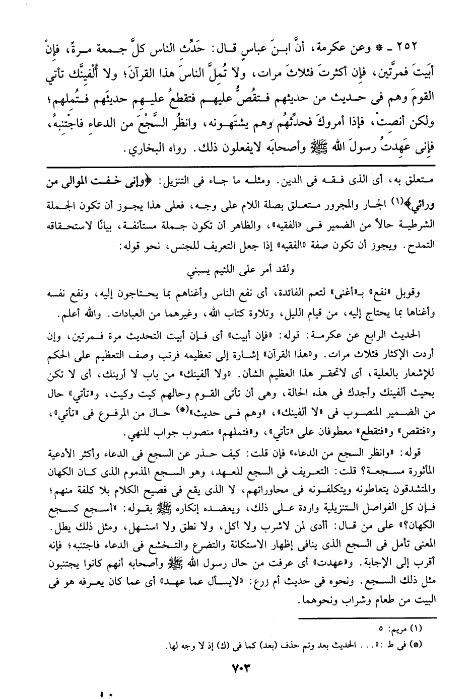 252 - وعن عكرمة، أن ابن عباس قال: حدث الناس كل جمعة مرة، فإن أبيت فمرتين، فإن أكثرت فثلاث مرات، ولا تمل الناس هذا القرآن؛ ولا ألفينك تأتي القوم وهم في حديث من حديثهم فتقص عليهم فتقطع عليهم حديثهم فتملهم؛ ولكن أنصت، فإذا أمروك فحدثهم وهم يشتهونه، وانظر السجع من الدعاء فاجتنبه، فإني عهدت رسول الله صلى الله عليه وسلم وأصحابه لا يفعلون ذلك. رواه البخاري.
