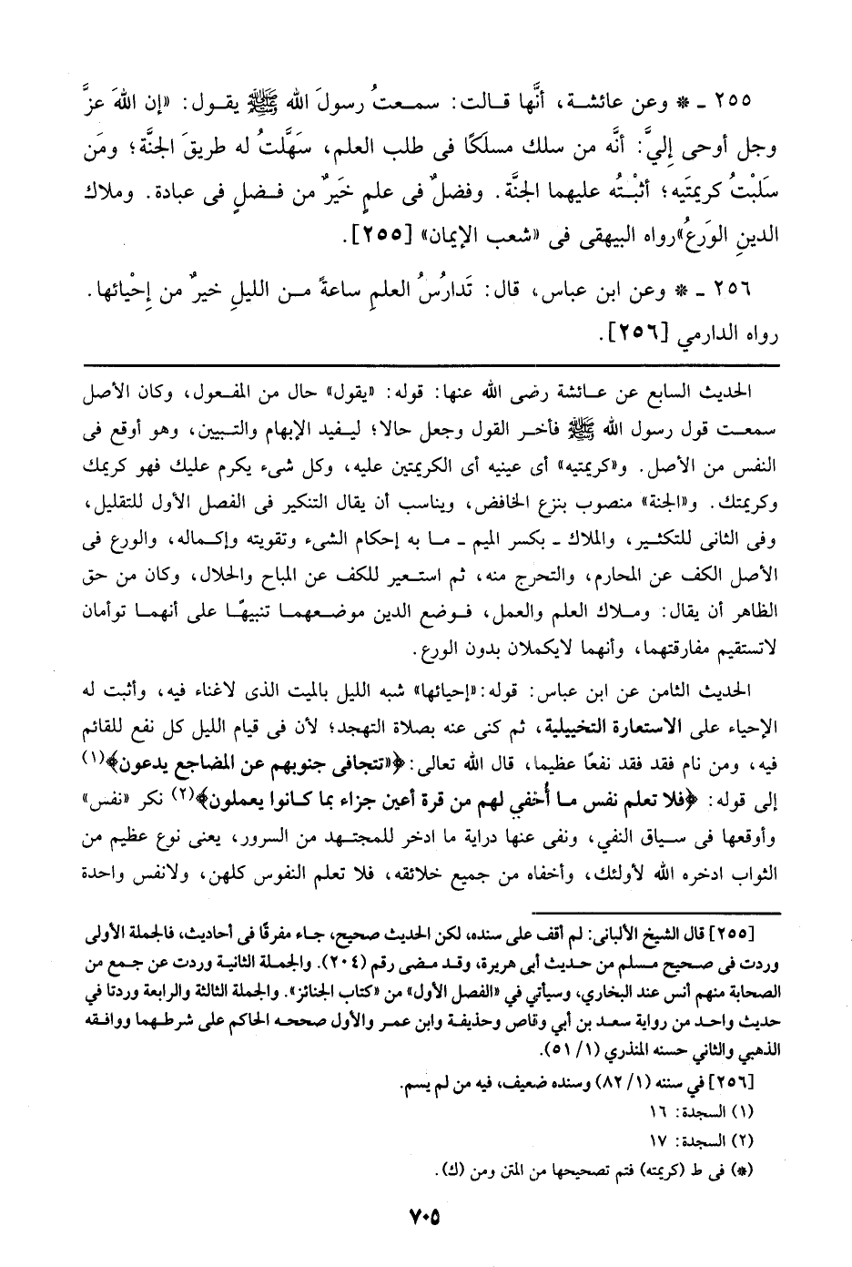 255 - وعن عائشة، أنها قالت: سمعت رسول الله صلى الله عليه وسلم يقول: ((إن الله عز وجل أوحى إلي: أنه من سلك مسلكاً في طلب العلم، سهلت له طريق الجنة؛ ومن سلبت كريمتيه؛ أثبته عليهما الجنة. وفضل في علم خير من فضل في عبادة. وملاك الدين الورع)) رواه البيهقي في ((شعب الإيمان)) [255].