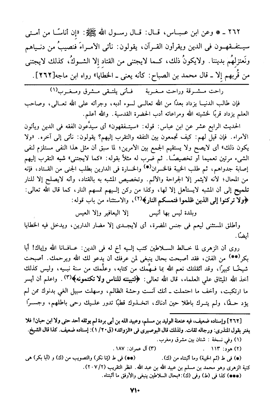 262 - وعن ابن عباس، قال: قال رسول الله صلى الله عليه وسلم: ((إن أناساً من أمتي سيتفقهون في الدين ويقرأون القرآن، يقولون: نأتي الأمراء فنصيب من دنياهم ونعتزلهم بديننا. ولا يكون ذلك، كما لا يجتني من القتاد إلا الشوك، كذلك لا يجتني من قربهم إلا- قال محمد بن الصباح: كأنه يعني- الخطايا)) رواه ابن ماجه [262].