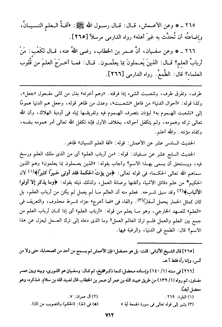 266 - وعن سفيان، أن عمر بن الخطاب، رضي الله عنه، قال لكعب: من أرباب العلم؟ قال: الذين يعملون بما يعلمون. قال: فما أخرج العلم من قلوب العلماء؟ قال: الطمع. رواه الدارمي [266].