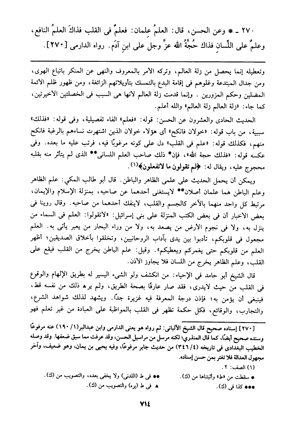 270 - وعن الحسن، قال: العلم علمان: فعلم في القلب فذاك العلم النافع، وعلم على اللسان فذاك حجة الله عز وجل على ابن آدم. رواه الدارمي [270].