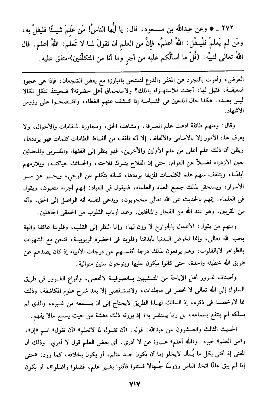 272 - وعن عبد الله بن مسعود، قال: يا أيها الناس! من علم شيئاً فليقل به، ومن لم يعلم فليقل: الله أعلم، فإن من العلم أن تقول لما لا تعلم: الله أعلم. قال الله تعالى لنبيه: (قل ما أسألكم عليه من أجر وما أنا من المتكلفين). متفق عليه.
