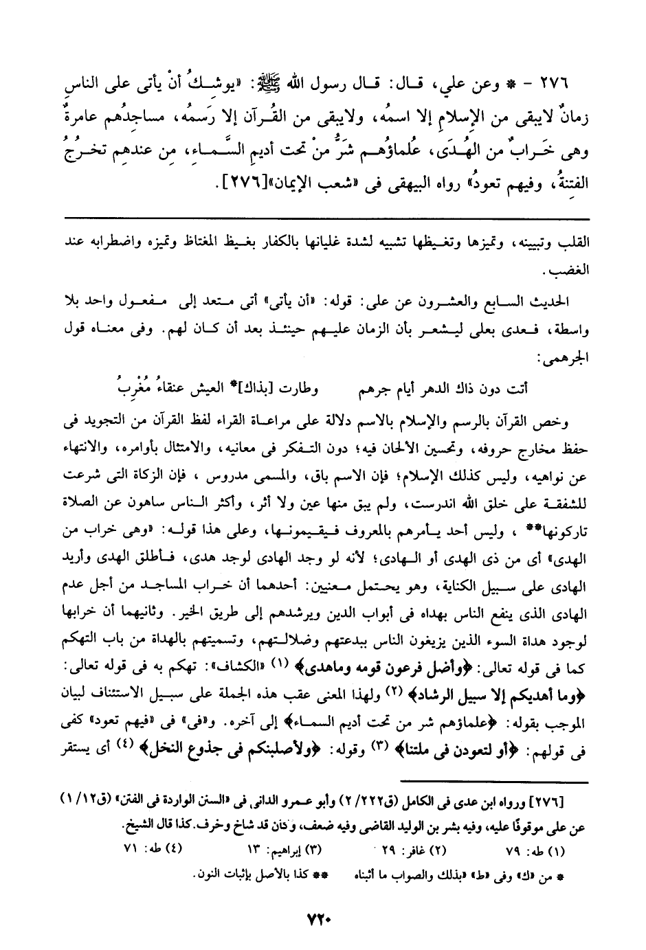 276 - وعن علي، قال: قال رسول الله صلى الله عليه وسلم: ((يوشك أن يأتي على الناس زمان لا يبقى من الإسلام إلا اسمه، ولا يبقى من القرآن إلا رسمه، مساجدهم عامرة وهي خراب من الهدى، علماؤهم شر من تحت أديم السماء، من عندهم تخرج الفتنة، وفيهم تعود)) رواه البيهقي في ((شعب الإيمان)) [276].