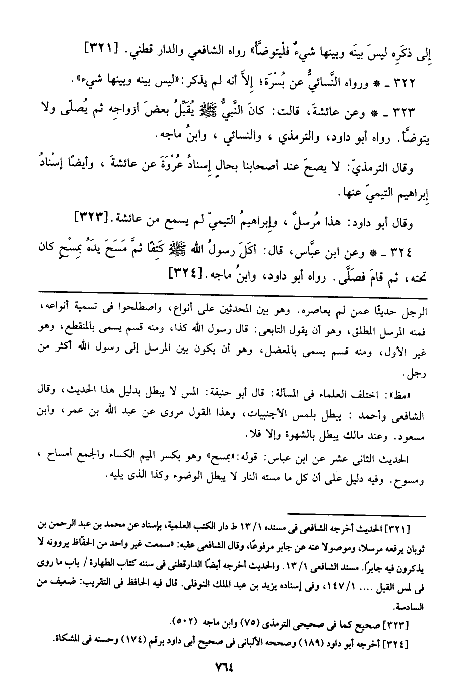 323 - وعن عائشة، قالت: كان النبي صلى الله عليه وسلم يقبل بعض أزواجه ثم يصلي ولا يتوضأ. رواه أبو داود، والترمذي، والنسائي، وابن ماجه.