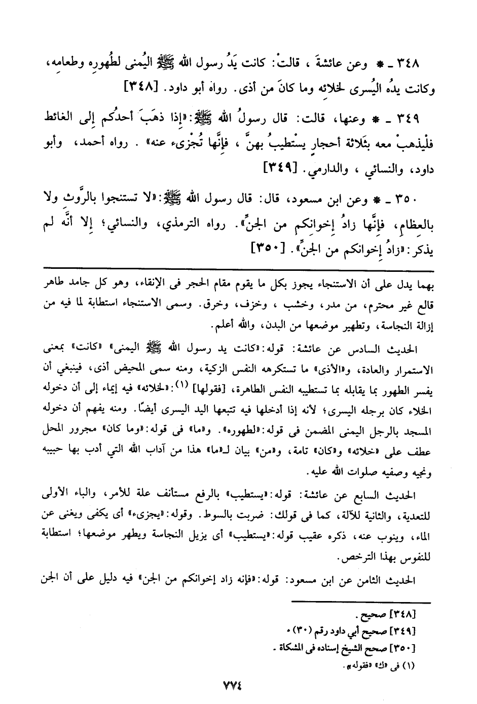 350 - وعن ابن مسعود، قال: قال رسول الله صلى الله عليه وسلم: ((لا تستنجوا بالروث ولا بالعظام، فإنها زاد إخوانكم من الجن)). رواه الترمذي، والنسائي، إلا أنه لم يذكر: ((زاد إخوانكم من الجن)). [350]