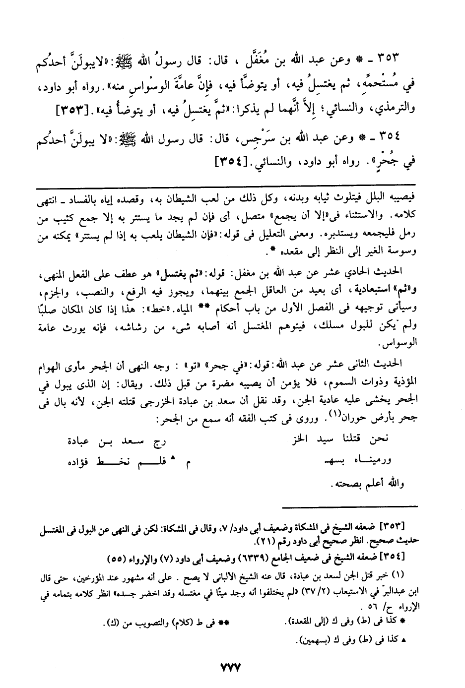 353 - وعن عبد الله بن مغفل، قال: قال رسول الله صلى الله عليه وسلم: ((لا يبولن أحدكم في مستحمه، ثم يغتسل فيه، أو يتوضأ فيه، فإن عامة الوسواس منه)). رواه أبو داود، والترمذي، والنسائي؛ إلا أنهما لم يذكرا: ((ثم يغتسل فيه، أو يتوضأ فيه)). [353]