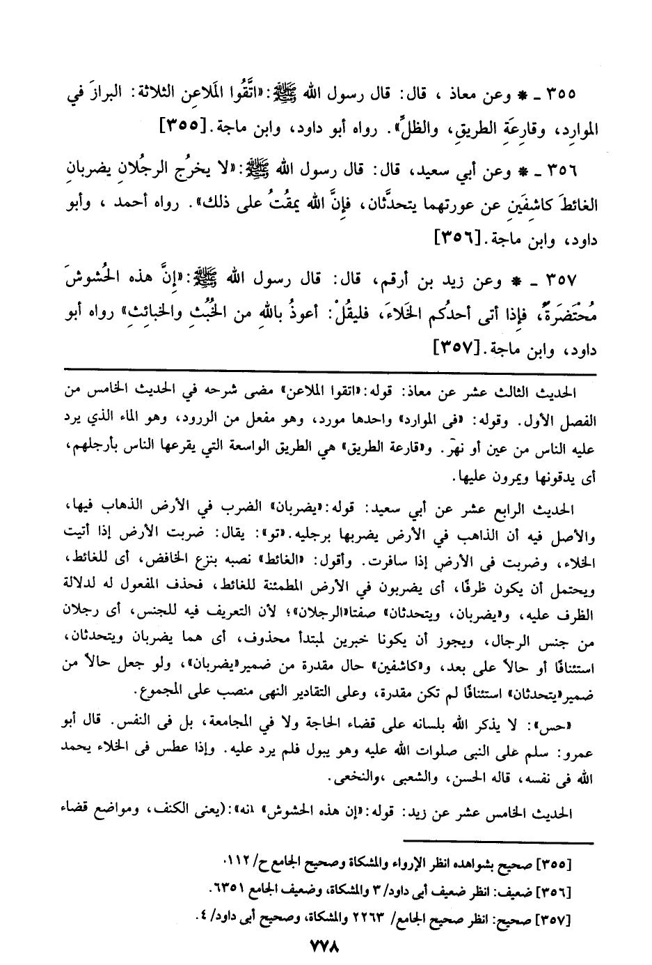 355 - وعن معاذ، قال: قال رسول الله صلى الله عليه وسلم: ((اتقوا الملاعن الثلاثة: البراز في الموارد، وقارعة الطريق، والظل)). رواه أبو داود، وابن ماجة. [355]