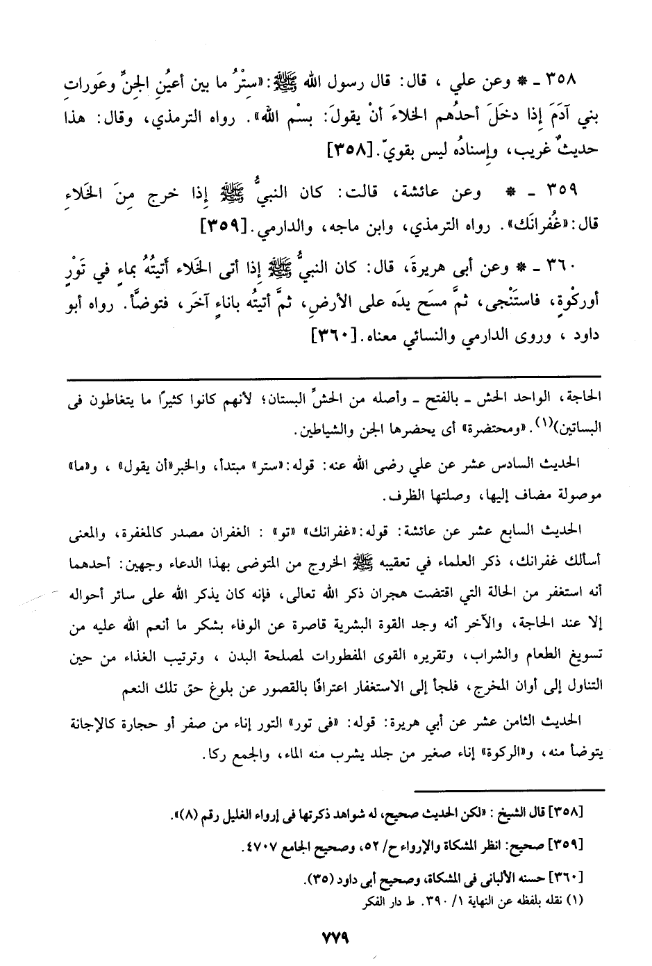 358 - وعن علي، قال: قال رسول الله صلى الله عليه وسلم: ((ستر ما بين أعين الجن وعورات بني آدم إذا دخل أحدهم الخلاء أن يقول: بسم الله)). رواه الترمذي، وقال: هذا حديث غريب، وإسناده ليس بقوي. [358]