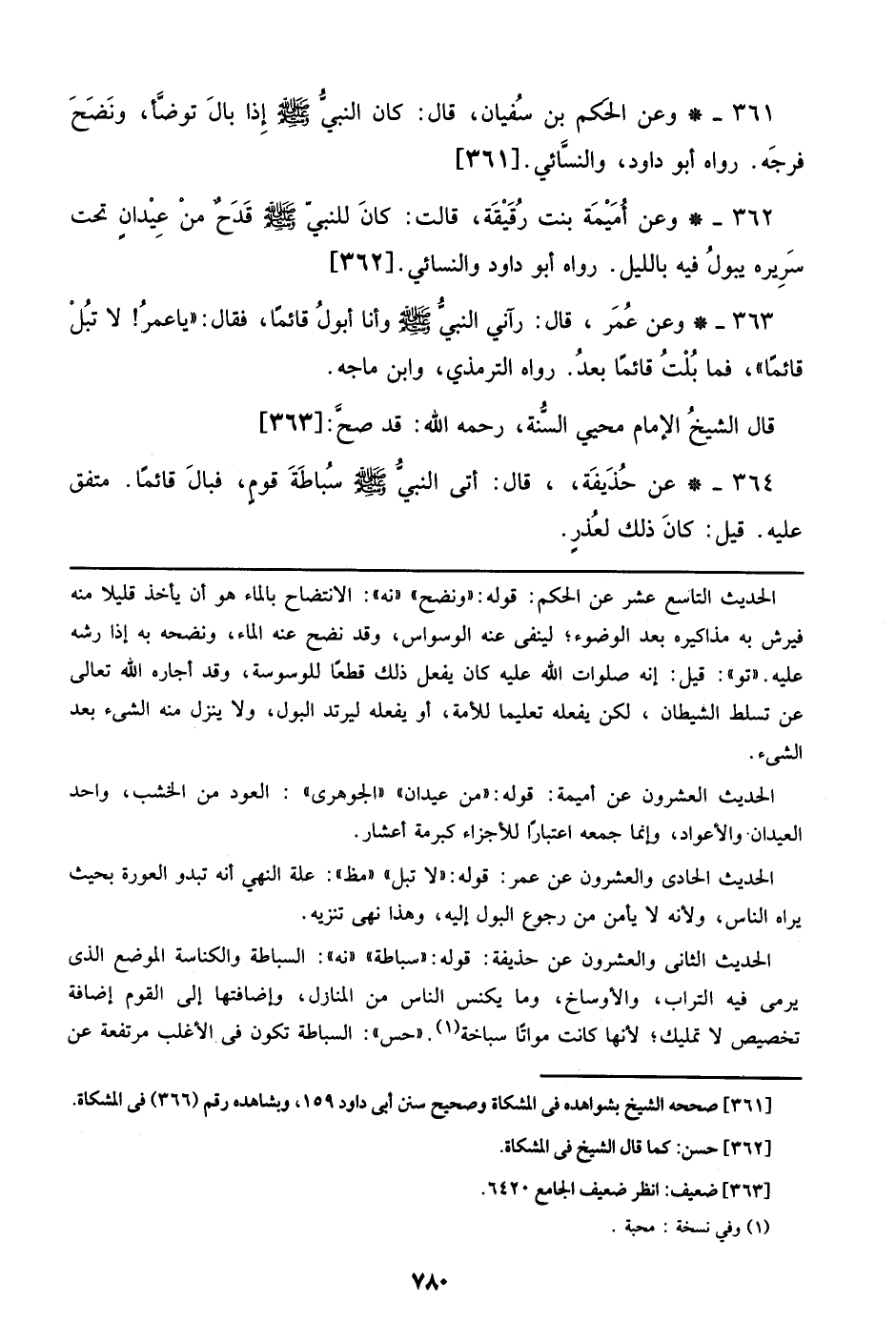 363 - وعن عمر، قال: رإني النبي صلى الله عليه وسلم وأنا أبول قائماً، فقال: ((يا عمر! لا تبل قائماً))، فما بلت قائماً بعد. رواه الترمذي، وابن ماجه.