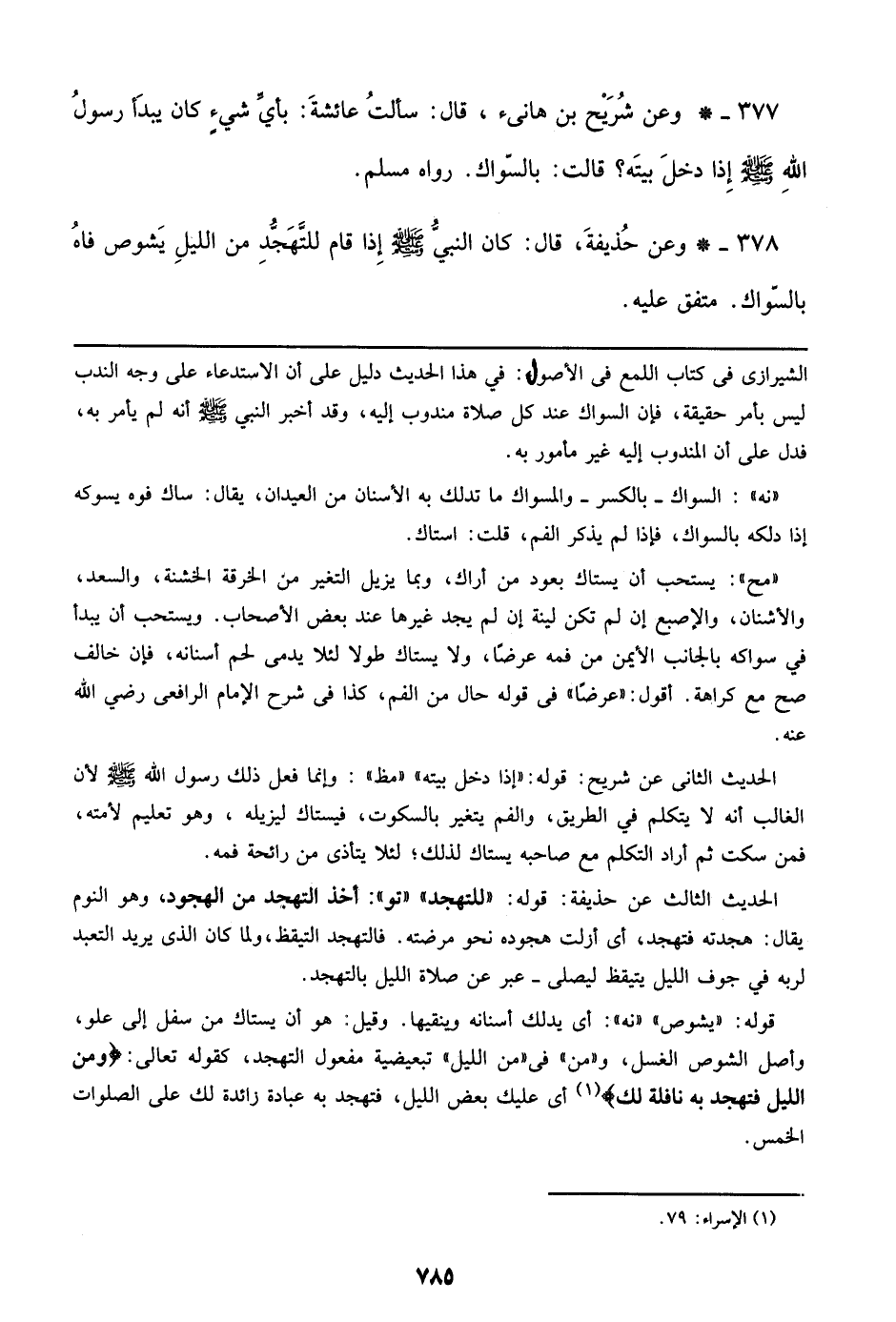 378 - وعن حذيفة، قال: كان النبي صلى الله عليه وسلم إذا قام للتهجد من الليل يشوص فاه بالسواك. متفق عليه.