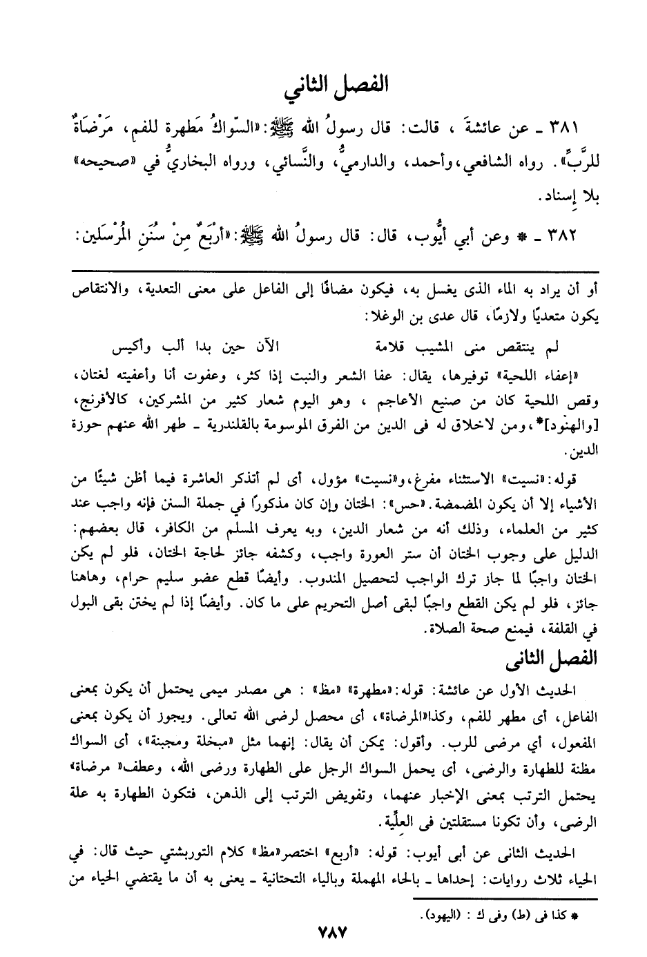 الحديث الأول عن عائشة: قوله: ((مطهرة)) ((مظ)): هي مصدر ميمي يحتمل أن يكون بمعنى الفاعل، أي مطهر للفم، وكذا ((المرضاة))، أي محصل لرضي الله تعالي. ويجوز أن يكون بمعنى المفعول، أي مرضي للرب. وأقول: يمكن أن يقال: إنهما مثل ((مبخلة ومجبنة))، أي السواك مظنة للطهارة والرضي، أي يحمل السواك الرجل علي الطهارة ورضي الله، وعطف ((مرضاة)) يحتمل الترتب بمعنى الإخبار عنهما، وتفويض الترتيب إلي الذهن، فتكون الطهارة به علة الرضا، وأن تكونا مستقلين في العلية.