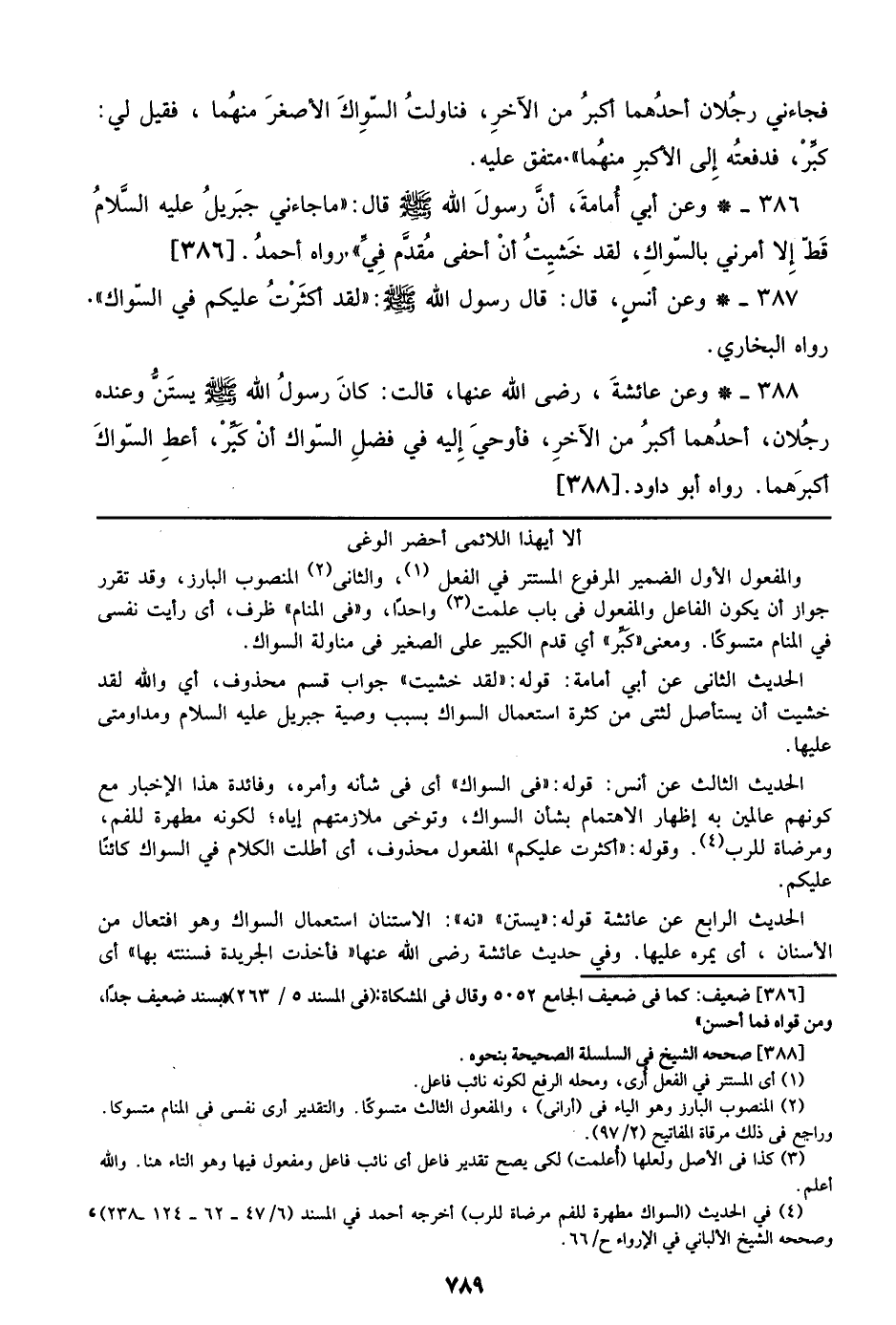 386 - وعن أبي أمامة، أن رسول الله صلى الله عليه وسلم قال: ((ما جاءني جبريل عليه السلام قط إلا أمرني بالسواك، لقد خشيت أن أحفي مقدم في)) رواه أحمد. [386]