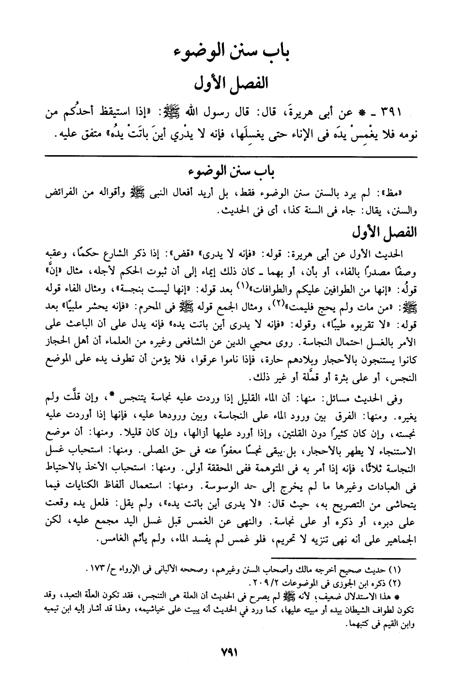 الحديث الأول عن أبي هريرة: قوله: ((فإنه لا يدري)) ((قض)): إذا ذكر الشارع حكماً، وعقبه وصفاً مصدراً بالفاء، أو بأن، أو بهما- كان ذلك إيماء إلي أن ثبوت الحكم لأجله، مثال ((إن)) قوله: ((إنها من الطوافين عليكم والطوافات)) بعد قوله: ((إنها ليست بنجسة))، ومثال الفاء قوله صلى الله عليه وسلم: ((من مات ولم يحج فليمت))، ومثال الجمع قوله صلى الله عليه وسلم في المحرم: ((فإنه يحشر ملبياً)) بعد قوله: ((لا تقربوه طيباً))، وقوله: ((فإنه لا يدري أين باتت يده)) فإنه يدل علي أن الباعث علي الأمر بالغسل احتمال النجاسة. روى محيي الدين عن الشافعي وغيره من العلماء أن أهل الحجاز كانوا يستنجون بالأحجار وبلادهم حارة، فإذا ناموا عرقوا، فلا يؤمن أن تطوف يده علي الموضع النجس، أو علي بثرة أو قملة أو غير ذلك.