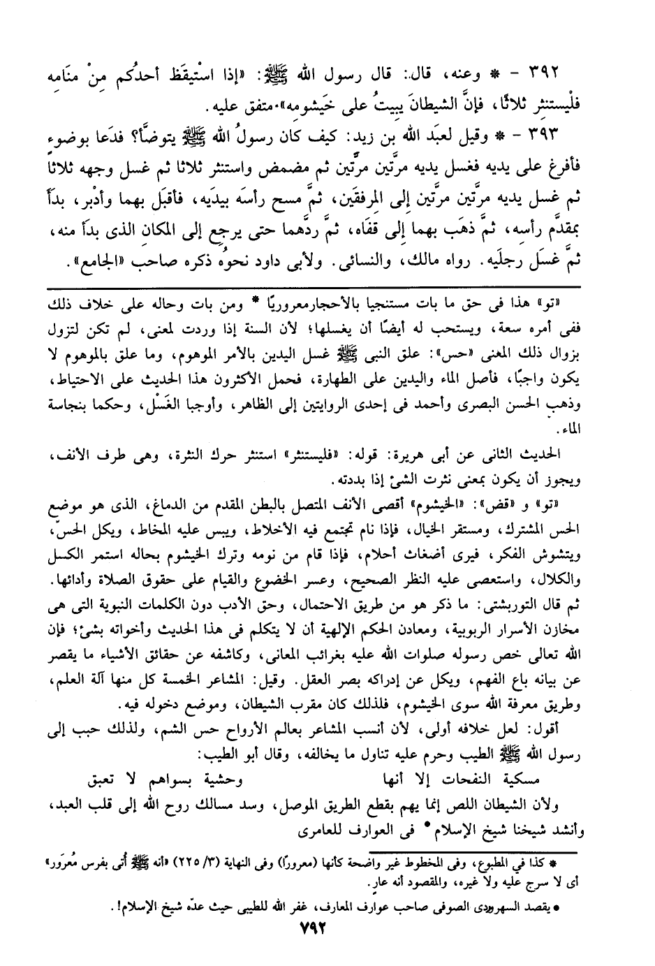 ((تو)) و ((قض)): ((الخيشوم)) أقصى الأنف المتصل بالبطن المقدم من الدماغ، الذي هو موضع الحس المشترك، ومستقر الخيال، فإذا نام تجتمع فيه الأخلاط، ويبس عليه المخاط، ويكل الحس، ويتشوش الفكر، فيرى أضغاث أحلام، فإذا قام من نومه وترك الخيشوم بحاله استمر الكسل والكلال، واستعصى عليه النظر الصحيح، وعسر الخضوع والقيام علي حقوق الصلاة وأدائها. ثم قال التوربشتي: ما ذكر هو من طريق الاحتمال، وحق الأدب دون الكلمات النبوية التي هي مخازن الأسرار الربوبية، ومعادن الحكم الإلهية أن لا يتكلم في هذا الحديث وأخواته بشيء؛ فإن الله تعالي خص رسوله صلوات الله عليه بغرائب المعإني، وكاشفه عن حقائق الأشياء ما يقصر عن بيانه باع الفهم، ويكل عن إدراكه بصر العقل. وقيل: المشاعر الخمسة كل منها آلة العلم، وطريق معرفة الله سوى الخيشوم، فلذلك كان مقرب الشيطان، وموضع دخوله فيه.