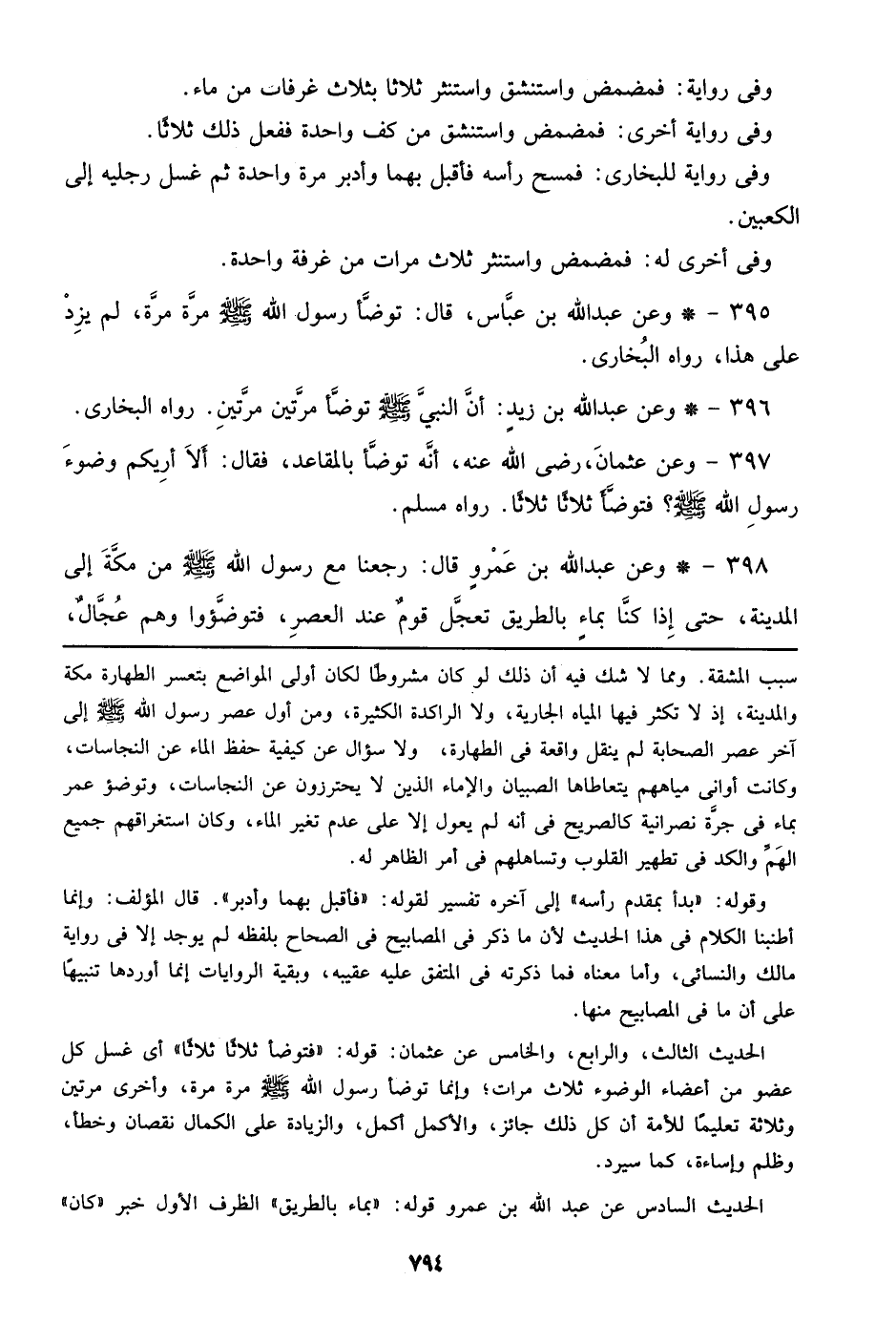397 - وعن عثمان، رضي الله عنه، أنه توضأ بالمقاعد، فقال: ألا أريكم وضوء رسول الله صلى الله عليه وسلم؟ فتوضأ ثلاثاً ثلاثاً. رواه مسلم.
