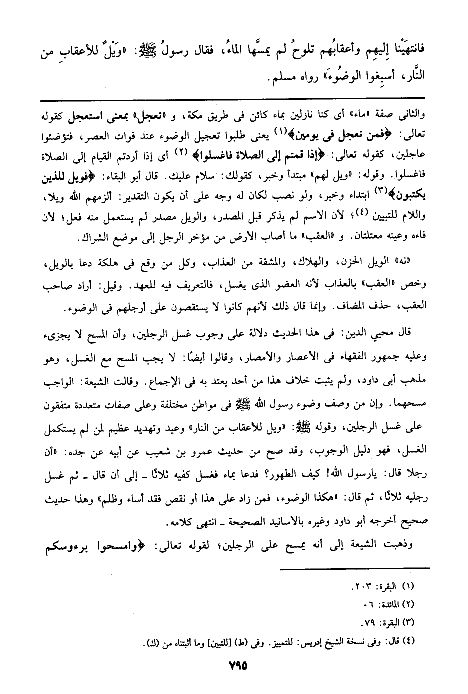 قال محيي الدين: في هذا الحديث دلالة علي وجوب غسل الرجلين، وأن المسح لا يجزئ وعليه جمهور الفقهاء في الأعصار والأمصار، وقالوا أيضاً: لا يجب المسح مع الغسل، وهو مذهب أبي داود، ولم يثبت خلاف هذا من أحد يعتد به في الإجماع. وقالت الشيعة: الواجب مسحهما. وإن من وصف وضوء رسول الله صلى الله عليه وسلم في مواطن مختلفة وعلي صفات متعددة متفقون علي غسل الرجلين، وقوله صلى الله عليه وسلم: ((ويل للأعقاب من النار)) وعيد وتهديد عظيم لمن لم يستكمل الغسل، فهو دليل الوجوب، وقد صح من حديث عمرو بن شعيب عن أبيه عن جده: ((أن رجلاً قال: يا رسول الله! كيف الطهور. فدعا بماء فغسل كفيه ثلاثاً- إلي أن قال- ثم غسل رجليه ثلاثاً، ثم قال: ((هكذا الوضوء، فمن زاد علي هذا أو نقص فقد أساء وظلم)) وهذا حديث صحيح أخرجه أبو داود وغيره بالأسإنيد الصحيحة- انتهي كلامه.