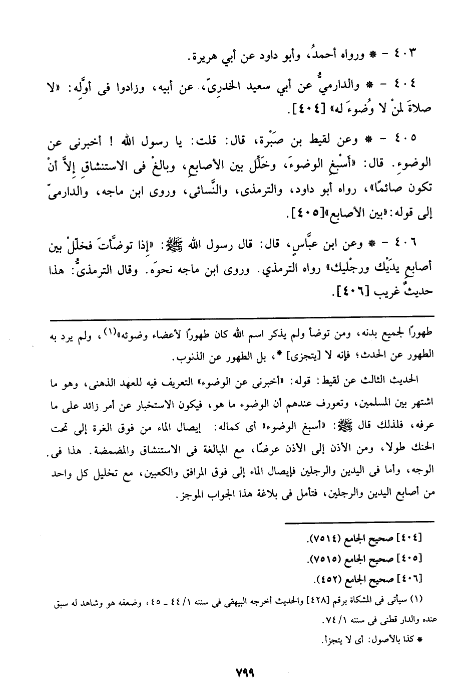 405 - وعن لقيط بن صبره، قال: قلت: يا رسول الله! أخبرني عن الوضوء. قال: ((أسبغ الوضوء، وخلل بين الأصابع، وبالغ في الاستنشاق إلا أن تكون صائماً))، رواه أبو داود، والترمذي، والنسائي، وروى ابن ماجه، والدارمي إلي قوله: ((بين الأصابع)) [405].