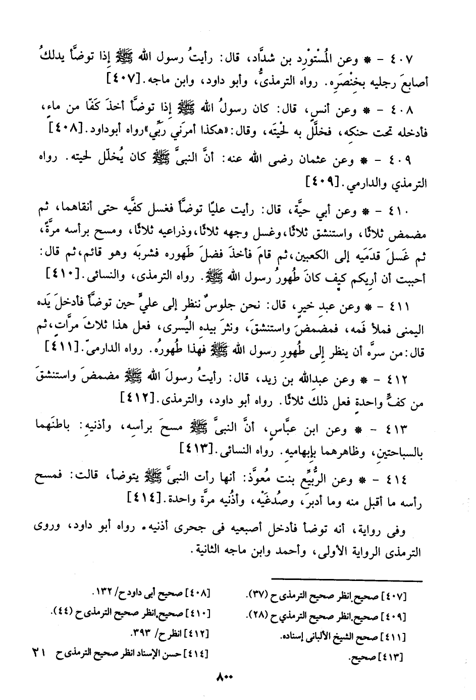 407 - وعن المستورد بن شداد، قال: رأيت رسول الله صلى الله عليه وسلم إذا توضأ يدلك أصابع رجليه بخنصره. رواه الترمذي، وأبو داود، وابن ماجه. [407]