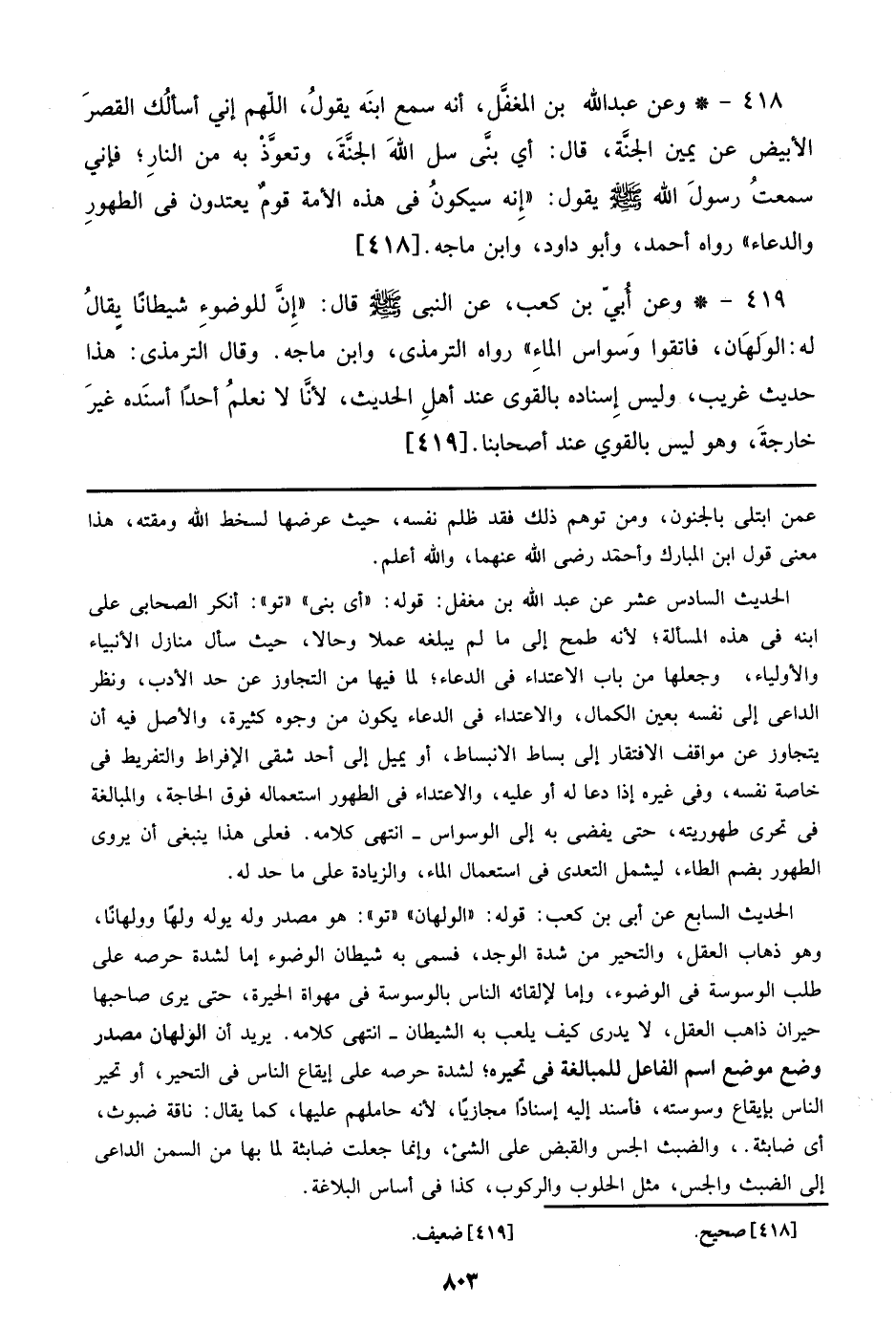 418 - وعن عبد الله بن المغفل، أنه سمع ابنه يقول، اللهم إني أسألك القصر الأبيض عن يمين الجنة، قال: أي بني سل الله الجنة، وتعوذ به من النار؛ فإني سمعت رسول الله صلى الله عليه وسلم يقول: ((إنه سيكون في هذه الأمة قوم يعتدون في الطهور والدعاء)) رواه أحمد، وأبو داود، وابن ماجه. [418]