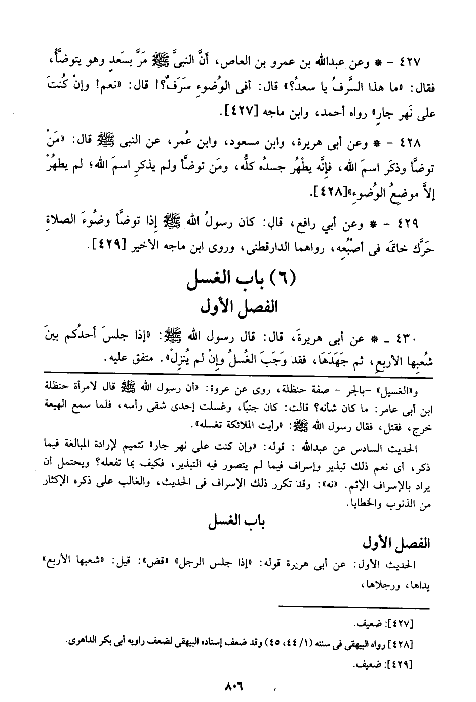 427 - وعن عبد الله بن عمرو بن العاص، أن النبي صلى الله عليه وسلم مر بسعد وهو يتوضأ، فقال: ((ما هذا السرف يا سعد؟)) قال: أفي الوضوء سرف؟! قال: ((نعم! وإن كنت علي نهر جار)) رواه أحمد، وابن ماجه [427].