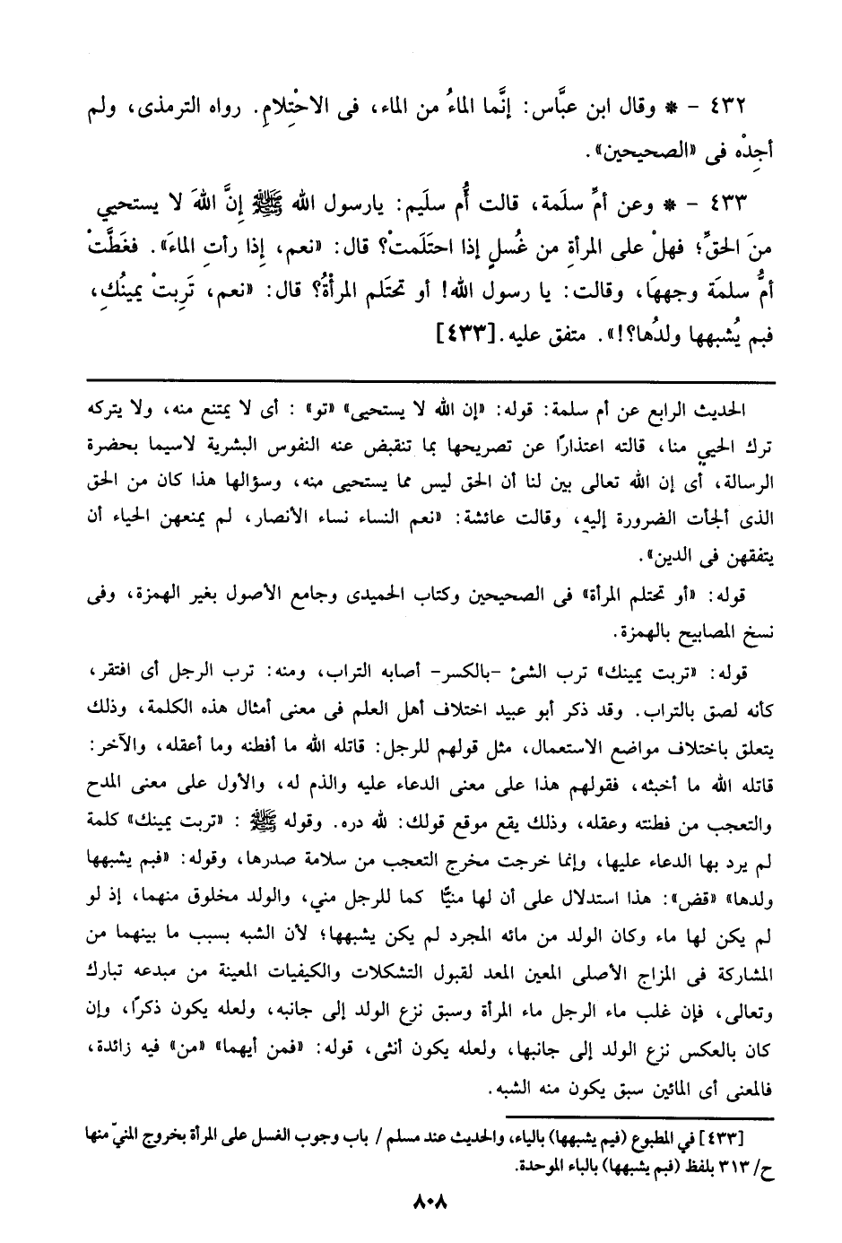 433 - وعن أم سلمة، قالت أم سليم: يا رسول الله صلى الله عليه وسلم إن الله لا يستحي من الحق؛ فهل علي المرأة من غسل إذا احتلمت؟ قال: ((نعم، إذا رأت الماء)). فغطت أم سلمة وجهها، وقالت: يا رسول الله! أو تحتلم المرأة؟ قال: ((نعم، تربت يمينك، فبم يشبهها ولدها؟!)). متفق عليه. [433]