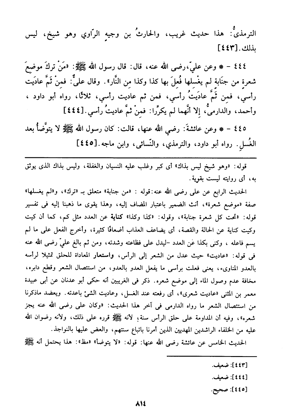 444 - وعن علي، رضي الله عنه، قال: قال رسول الله صلى الله عليه وسلم: ((من ترك موضع شعرة من جنابة لم يغسلها فعل بها كذا وكذا من النار)). قوال علي: فمن ثم عاديت رأسي، فمن ثم عاديت رأسي، فمن ثم عاديت رأسي، ثلاثاً، رواه أبو داود، وأحمد، والدارمي، إلا أنهما لم يكررا: فمن ثم عاديت رأسي. [444]
