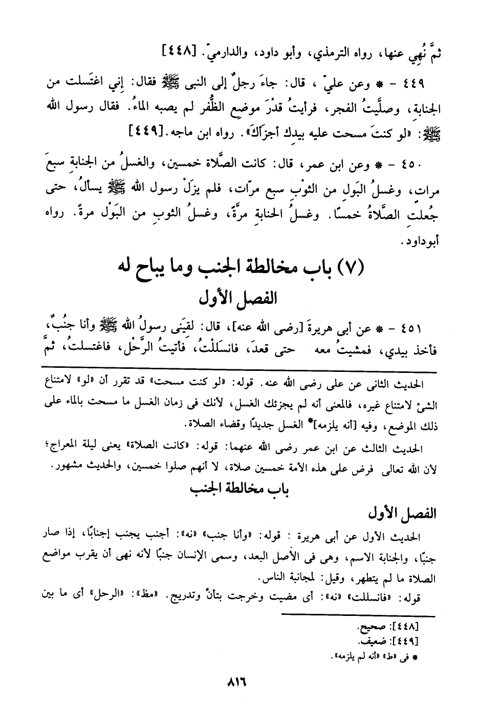 451 - عن أبي هريرة [رضي الله عنه]، قال: لقيني رسول الله صلى الله عليه وسلم وأنا جنب، فأخذ بيدي، فمشيت معه حتى قعد، فانسللت فأتيت الرحل، فاغتسلت ثم