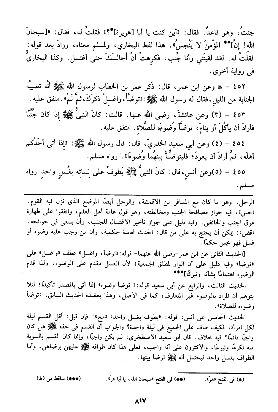 453 - (3) وعن عائشة، رضي الله عنها. قالت: كان النبي صلى الله عليه وسلم إذا كان جنباً فأراد أن يأكل أو ينام، توضأ وضوءه للصلاة. متفق عليه.