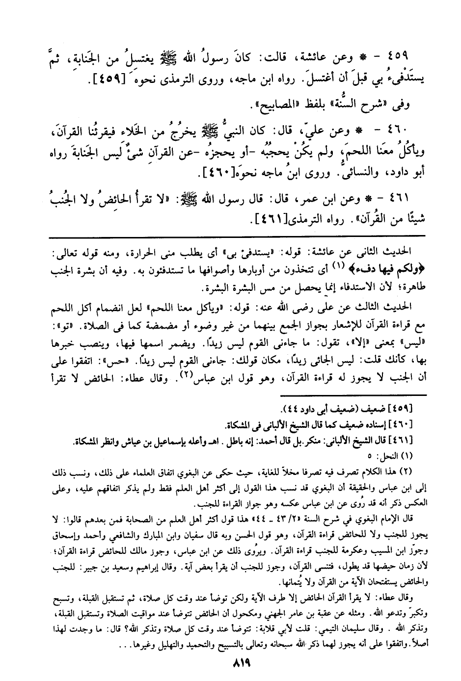 460 - وعن علي، قال: كان النبي صلى الله عليه وسلم يخرج من الخلاء فيقرئنا القرآن، ويأكل معنا اللحم، ولم يكن يحجبه- أو يحجزه- عن القرآن شيء ليس الجنابة رواه أبو داود، والنسائي. وروى ابن ماجه نحوه [460].