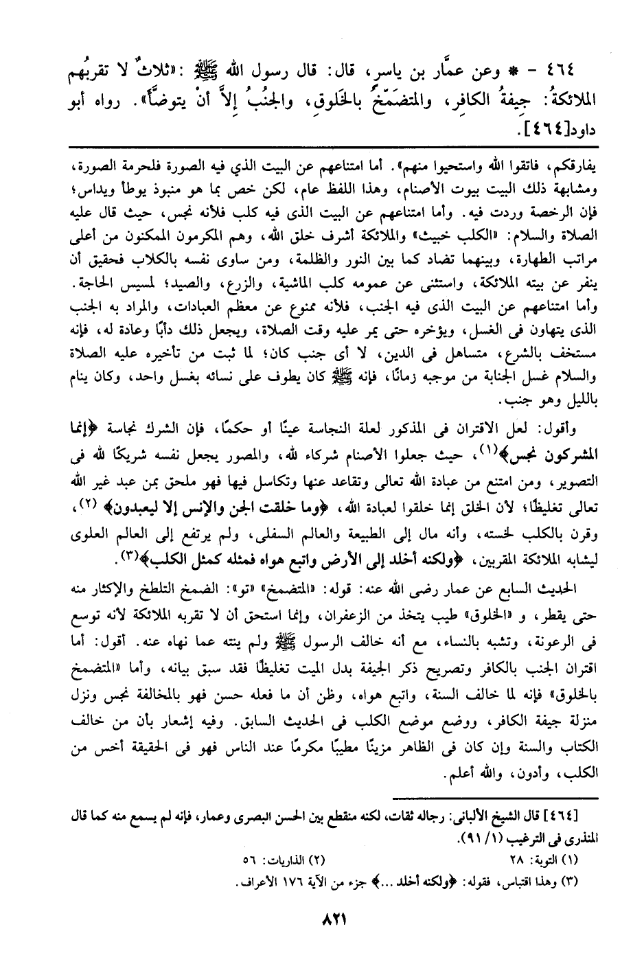 464 - وعن عمار بن ياسر، قال: قال رسول الله صلى الله عليه وسلم: ((ثلاث لا تقربهم الملائكة: جيفة الكافر، والمتضمخ بالخلوق، والجنب إلا أن يتوضأ)). رواه أبو داود [464].