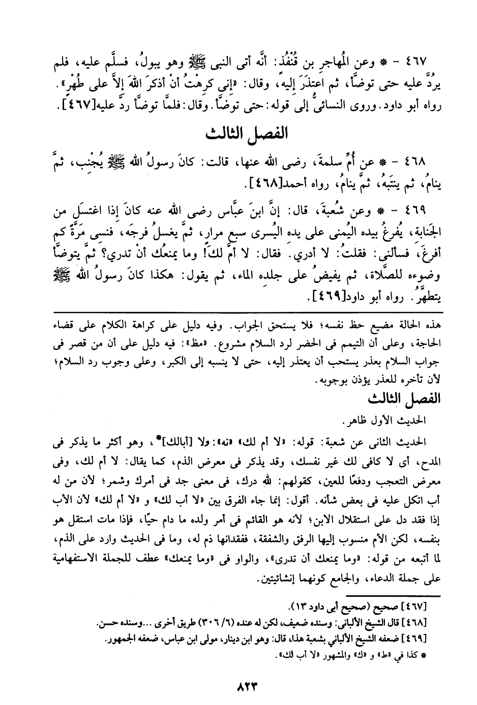 467 - وعن المهاجر بن قنفذ: أنه أتى النبي صلى الله عليه وسلم وهو يبول، فسلم عليه، فلم يرد عليه حتى يتوضأ، ثم اعتذر إليه، وقال: ((إني كرهت أن أذكر الله إلا علي طهر)). رواه أبو داود. وروى النسائي إلي قوله: حتى توضأ. وقال: فلما توضأ رد عليه [467].