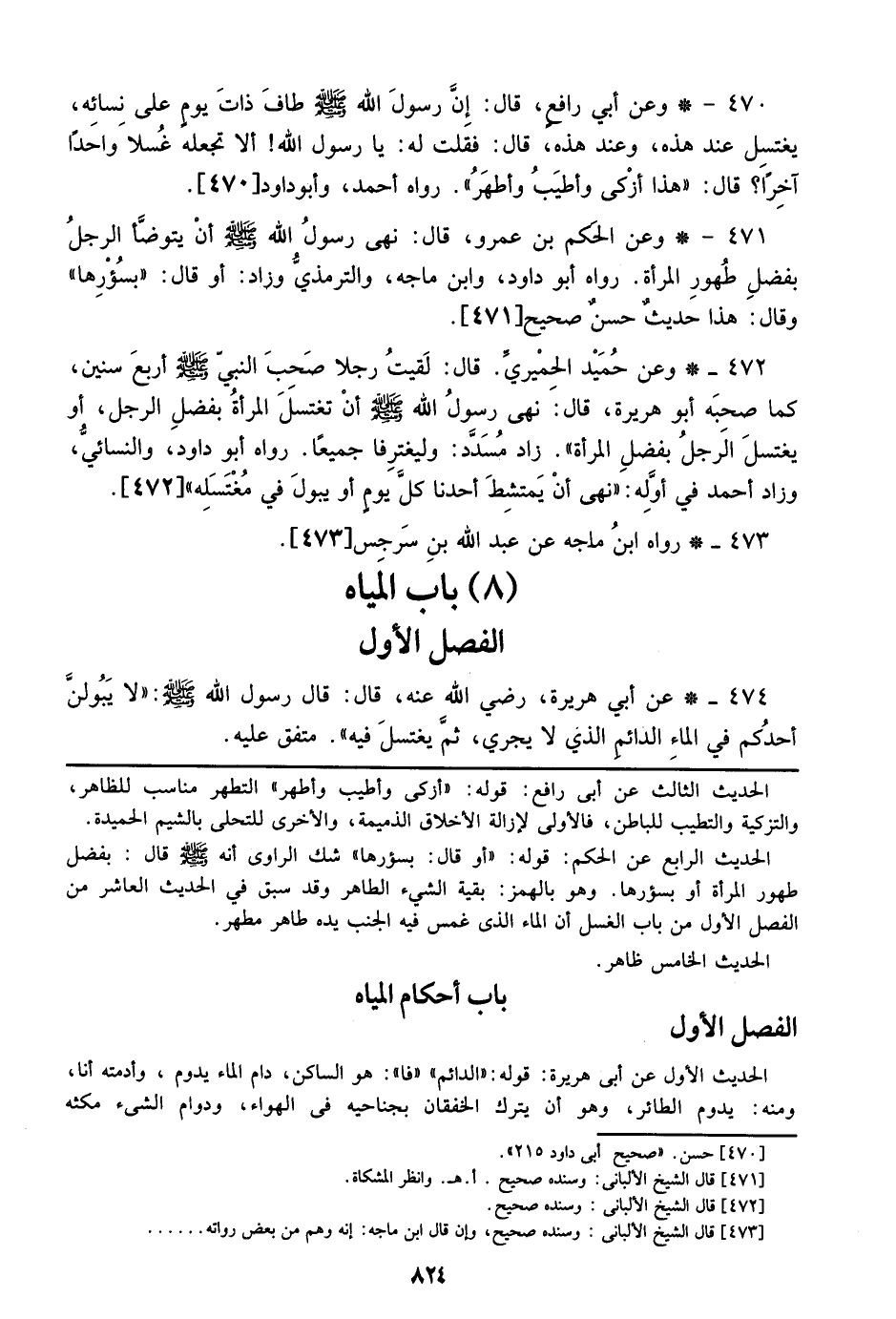 474 - عن أبي هريرة، رضي الله عنه، قال: قال رسول الله صلى الله عليه وسلم: ((لا يبولن أحدكم في الماء الدائم الذي لا يجري، ثم يغتسل فيه)). متفق عليه.