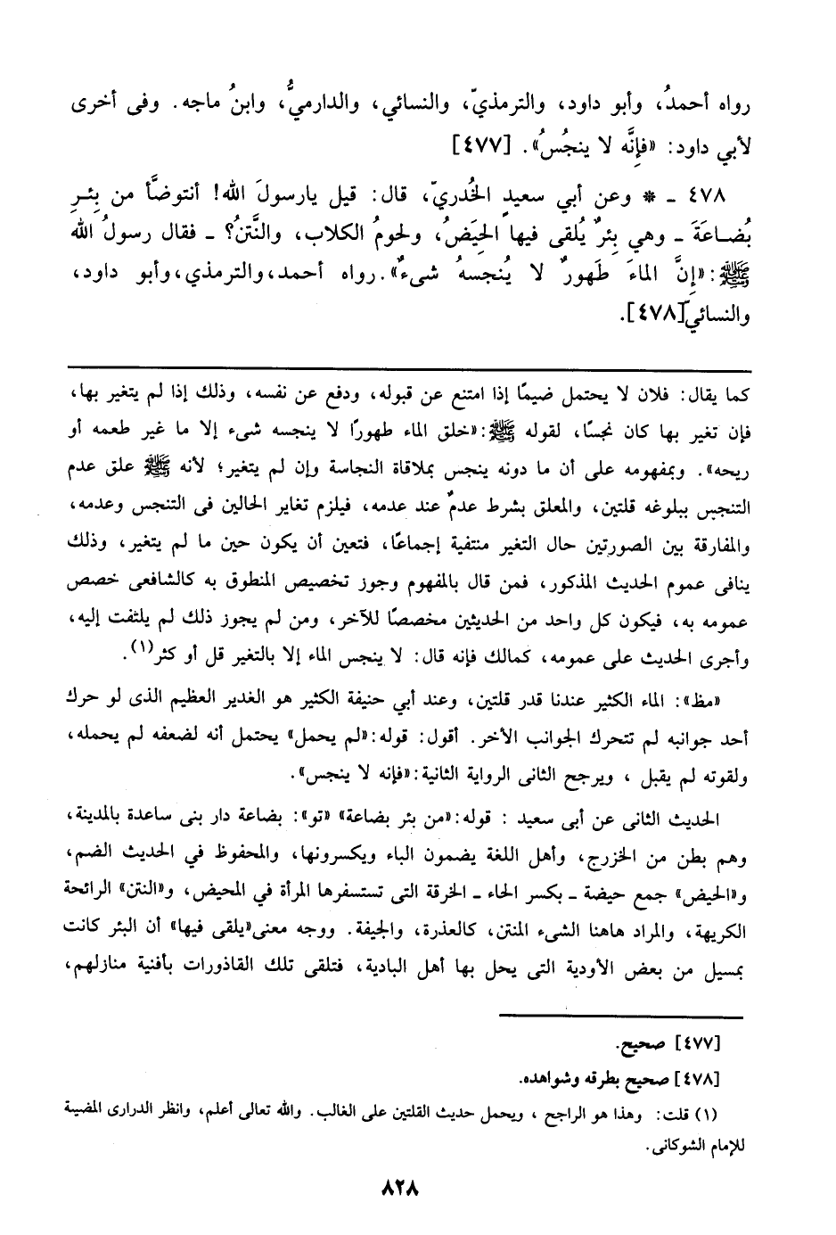 478 - وعن أبي سعيد الخدري، قال: قيل يا رسول الله! أنتوضأ من بئر بضاعة- وهي بئر يلقى فيها الحيض، ولحوم الكلاب، والنتن؟ - فقال رسول الله صلى الله عليه وسلم: ((إن الماء طهور لا ينجسه شيء)). رواه أحمد، والترمذي، وأبو داود، والنسائي [478].