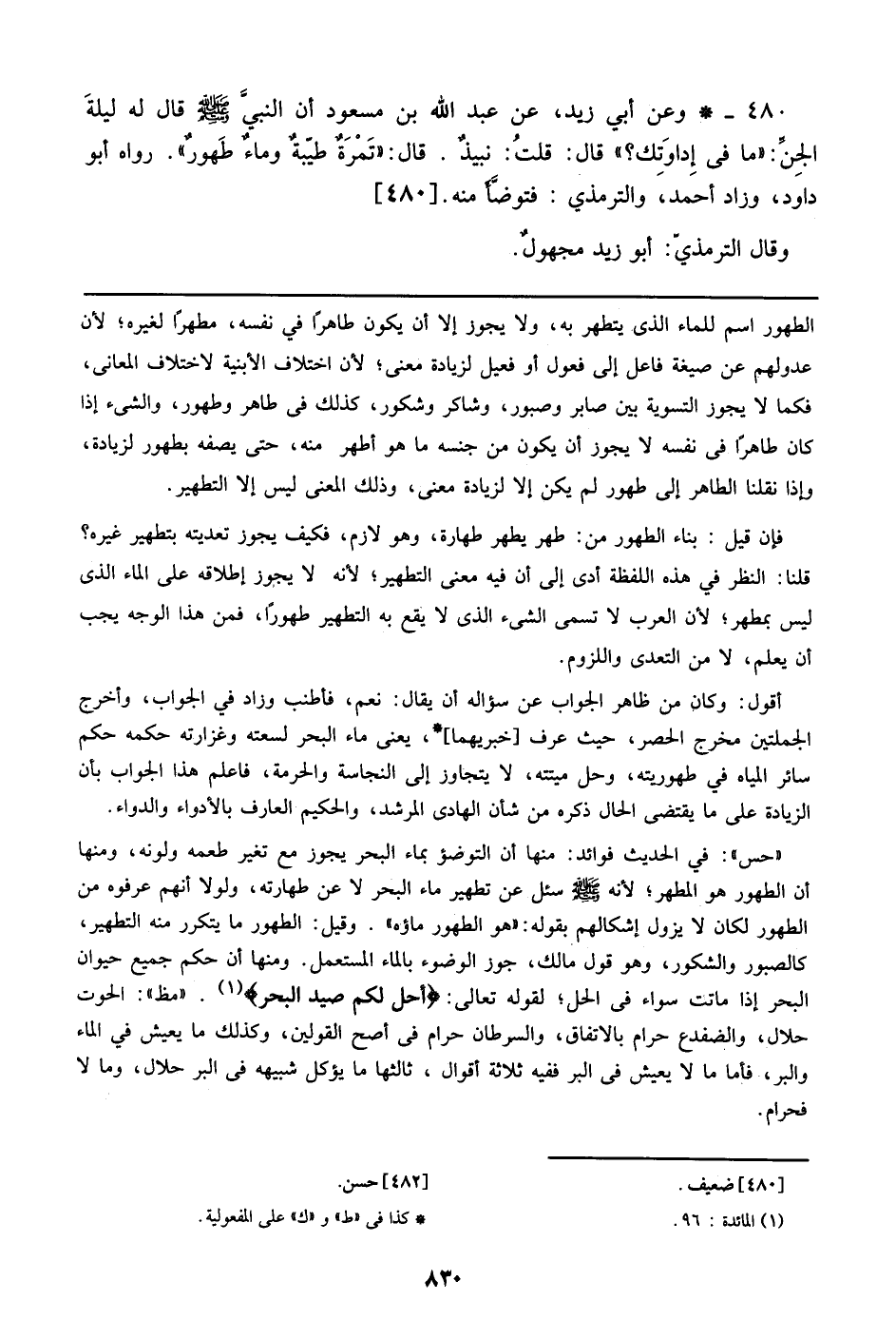 480 - وعن أبي زيد، عن عبد الله بن مسعود أن النبي صلى الله عليه وسلم قال له ليلة الجن: ((ما في إداوتك؟)) قال: قلت: نبيذ. قال: ((تمرة طيبة وماء طهور)). رواه أبو داود، وزاد أحمد، والترمذي: فتوضأ منه. [480]