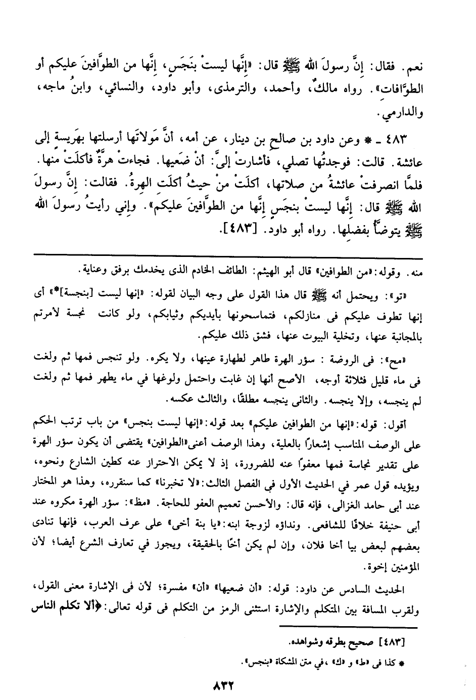 483 - وعن داود بن صالح بن دينار، عن أمه، أن مولاتها أرسلتها بهريسة إلي عائشة. قالت: فوجدتها تصلي، فأشارت إلي: أن ضعيها. فجاءت هرة فأكلت منها. فلما انصرفت عائشة من صلاتها، أكلت من حيث أكلت الهرة. فقالت: إن رسول الله صلى الله عليه وسلم قال: إنها ليست بنجس إنها من الطوافين عليكم)). وإني رأيت رسول الله صلى الله عليه وسلم يتوضأ بفضلها. رواه أبو داود. [483].