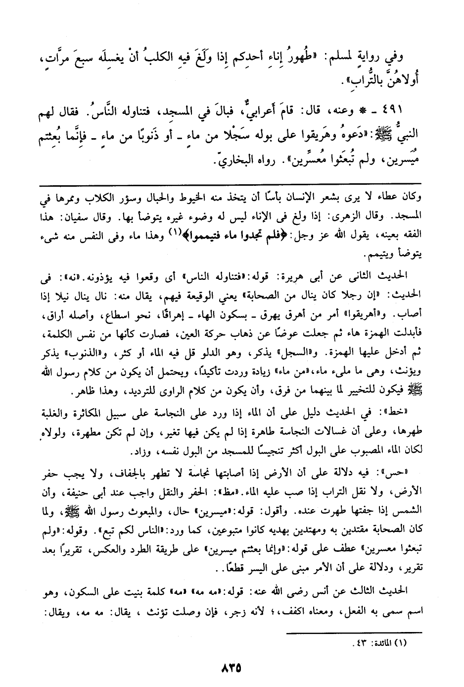 491 - وعنه، قال: قام أعرابي، فبال في المسجد، فتناوله الناس. فقال لهم النبي صلى الله عليه وسلم: ((دعوه وهريقوا علي بوله سجلا من ماء- أو ذنوباً من ماء- فإنما بعثتم ميسرين، ولم تبعثوا معسرين)). رواه البخاري.